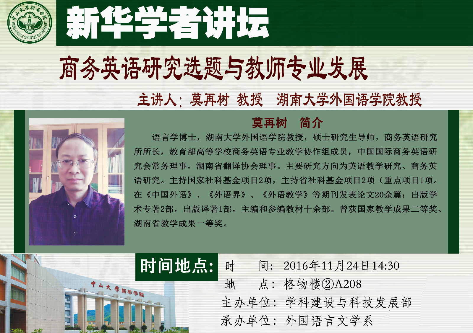 莫再树,语言学博士,湖南大学3044永利集团官网教授,硕士研究生导师,商务英语研究所所长,教育部高等学校3044永利集团官网教学协作组成员,中国国际商务英语研究会常务理事,湖南省翻译协会理事。主要研究方向为英语教学研究、商务英语研究。主持国家社科基金项目2项,主持省社科基金项目2项(重点项目1项)。在《中国外语》、《外语界》、《外语教学》等期刊发表论文20余篇;出版学术专著2部,出版译著1部,主编和参编教材十余部。曾获国家教学成果二等奖、湖南省教学成果一等奖。讲座主要内容:
