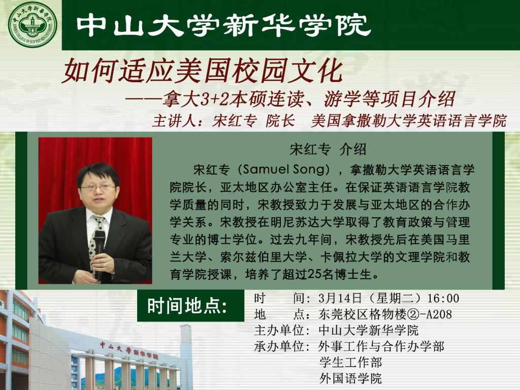 讲座题目:如何适应美国校园文化——拿大三加二本硕连读项目介绍