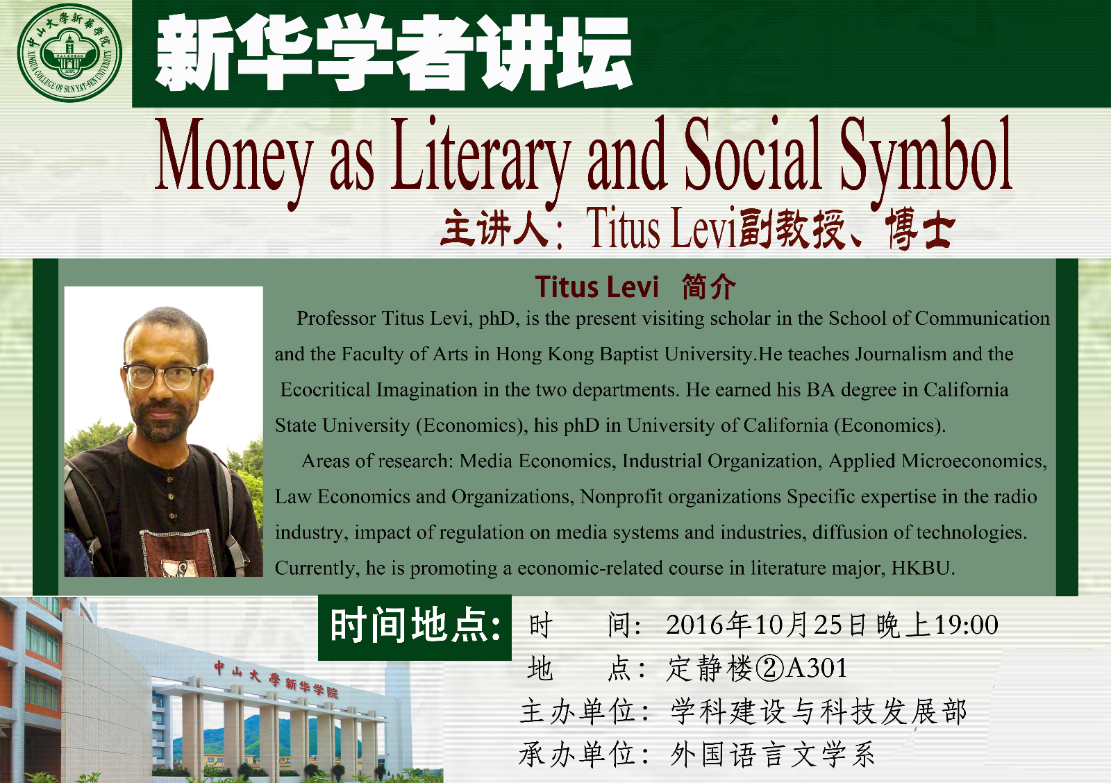 主讲人:Titus Levi副教授、博士讲座主题:Money as Literary and Social Symbol面向对象:全院师生讲座时间:2016年10月25日晚上19:00讲座地点:东莞校区定静楼②A301主办单位:学科建设与科技发展部承办单位:外国语言文学系 主讲嘉宾简介 Professor Titus Levi, phD, is the present visiting scholar in the School of Communication and the Faculty of Arts in Hong Kong Baptist University. He teaches Journalism and the Ecocritical Imagination in the two departments. He earned his BA degree in California State University (Economics), his phD in University of California (Economics).Areas of research: Media Economics, Industrial Organization, Applied Microeconomics, Law Economics and Organizations, Nonprofit organizations Specific expertise in the radio industry, impact of regulation on media systems and industries, diffusion of technologies.Currently, he is promoting an economic-related course in literature major, HKBU. 讲座主要内容 Professor Titus 将用自己多年在经济学和文学双领域积累的经验,与我系英专和商英师生一起,共话跨学科领域学习和生存的潜在性和生命力,鼓励同学们在本专业知识学习过程中跳出固有思维,用不同的角度思考问题,为精彩的人生寻找不同的可能性。 外国语言文学系2016年10月24日