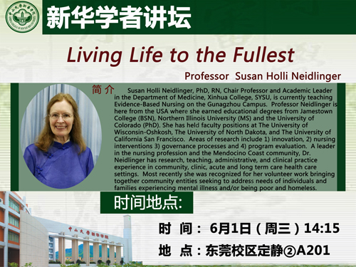 Susan Holli Neidlinger, PhD, RN, Chair Professor and Academic Leader in the Department of Medicine, Xinhua College, SYSU, is currently teaching Evidence-Based Nursing on the Gunagzhou Campus. Professor Neidlinger is here from the USA where she earned educational degrees from Jamestown College (BSN), Northern Illinois University (MS) and the University of Colorado (PhD). She has held faculty positions at The University of Wisconsin-Oshkosh, The University of North Dakota, and The University of California San Francisco. Areas of research include 1) innovation, 2) nursing interventions 3) governance processes and 4) program evaluation. A leader in the nursing profession and the Mendocino Coast community, Dr. Neidlinger has research, teaching, administrative, and clinical practice experience in community, clinic, acute and long term care health care settings. Most recently she was recognized for her volunteer work bringing together community entities seeking to address needs of individuals and families experiencing mental illness and/or being poor and homeless.