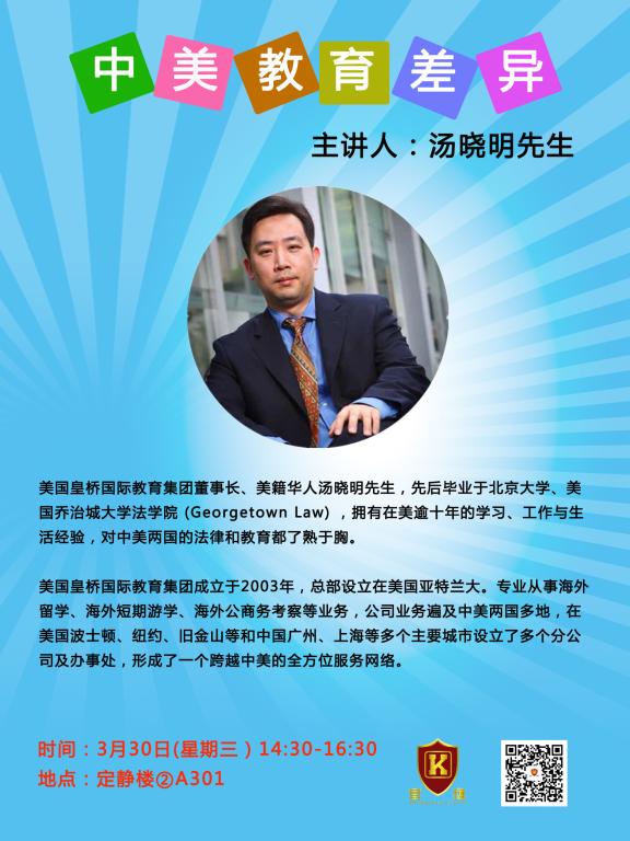 为帮助同学们了解中国和美国的教育差异,促进不同文化之间的交流和碰撞,并增长自身的见识,中山大学新华学院现特邀请美国皇桥国际教育集团董事长、美籍华人汤晓明先生为大家开设《中美教育差异》专题讲座,与同学们进行交流和沟通。