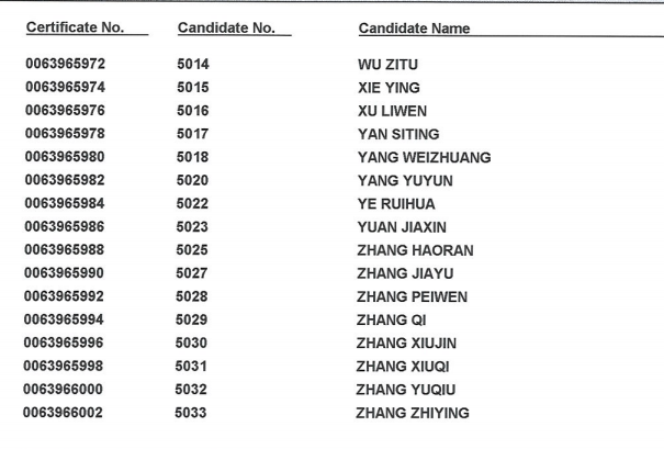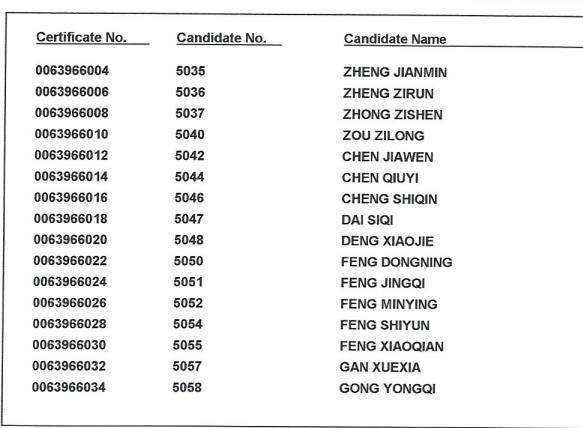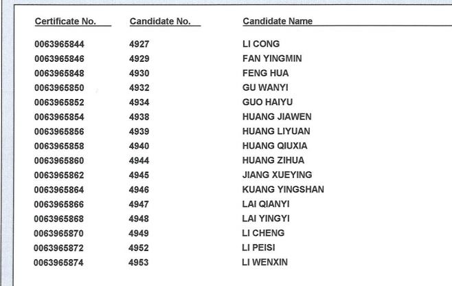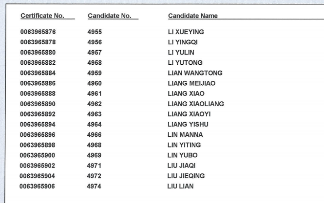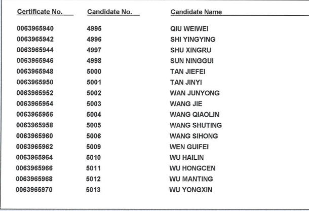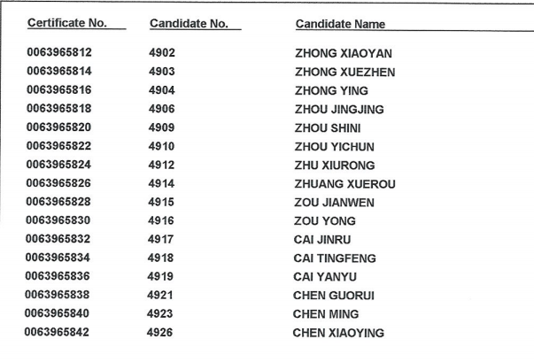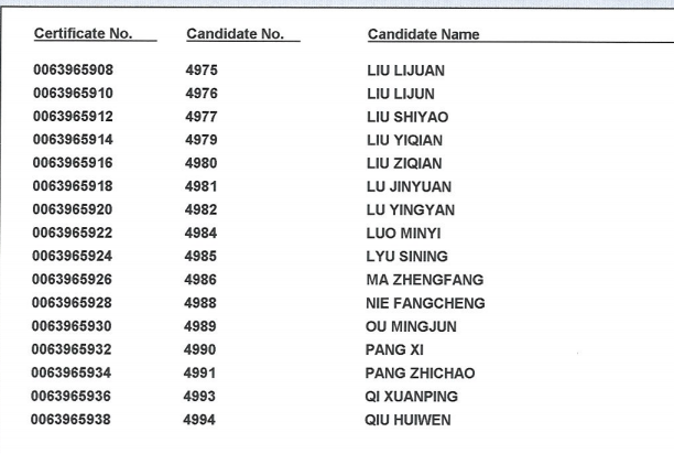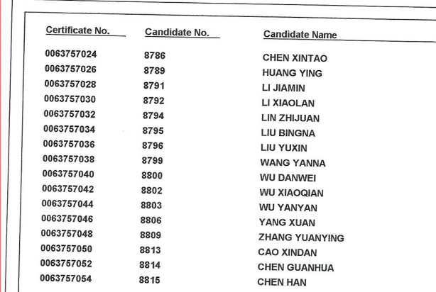 2018年11月17日 剑桥商务英语(BEC)高级证书领取名单: