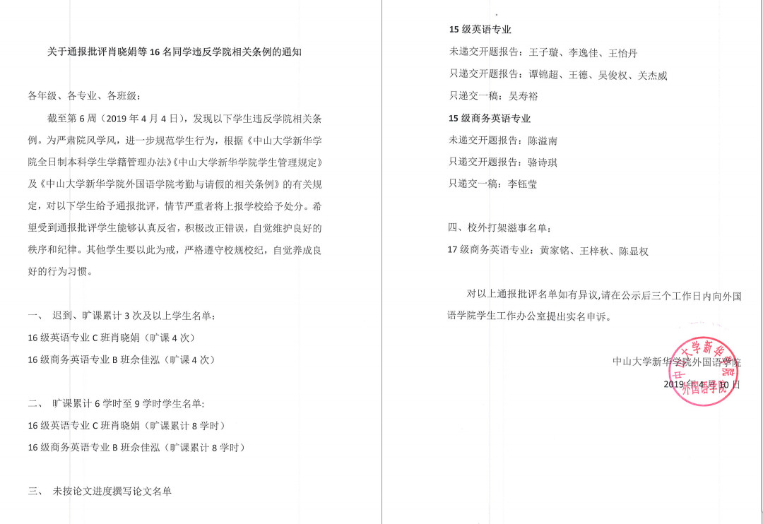 截至第6周(2019年4月4日),发现以下学生违反学院相关条例。为严肃院风学风,进一步规范学生行为,根据《中山大学新华学院全日制本科学生学籍管理办法》《中山大学新华学院学生管理规定》及《中山大学新华学院3044永利集团官网考勤与请假的相关条例》的有关规定,对以下学生给予通报批评,情节严重者将上报学校给予处分。希望受到通报批评学生能够认真反省,积极改正错误,自觉维护良好的秩序和纪律。其他学生要以此为戒,严格遵守校规校纪,自觉养成良好的行为习惯。