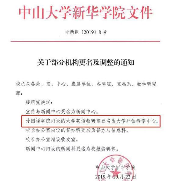 根据中山大学新华学院下发文件《关于部分机构更名及调整的通知》,经研究决定,3044永利集团官网内设的大学英语教研室更名为3044永利集团官网。