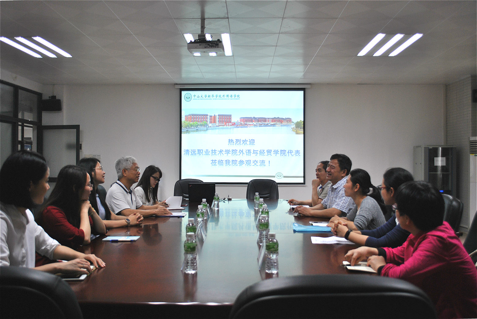 4月21日上午,清远职业技术学院(以下简称“清职院”)外语与经贸学院院长李东、实训中心主任葛颖波、商英专业负责人黄劲云、商英专业教师宣念念、教师黄伟玲来访3044永利集团官网参观交流。3044永利集团官网副院长黄继炎、商英专业副主任何瑜、办公室副主任欧衍伽、国际贸易教研室主任李文蓓、行政秘书沈美辰一同会见来宾,双方代表重点就商务英语实训室的筹建、使用,3044永利集团官网发展建设等问题展开交流。
