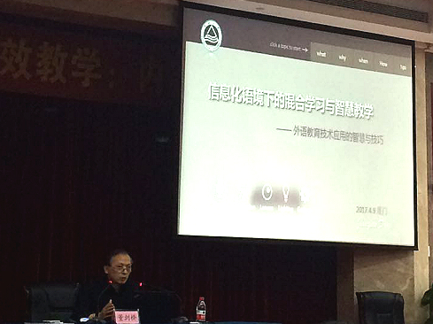 江南大学董剑桥教授就信息环境下的混合学习与智慧教学进行了发言。董剑桥教授介绍了什么是混合学习,为何外语适合混合学习,何时进行混合学习以及如何进行混合学习。此外,他还就微课的制作给出了一系列建设性意见。