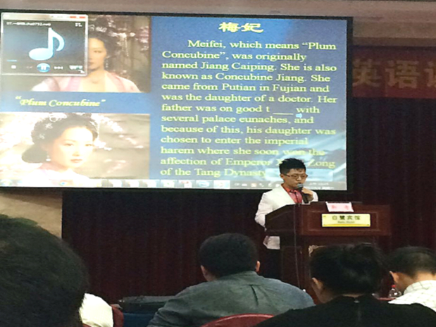 武汉大学副教授、2011年全国大学英语教学大赛全国决赛综合组冠军靳奇老师作了题为“一篇奇葩完形填空:一场幽幽深宫怨梦”示范教学展示。靳奇副教授以“梅妃”杨贵妃生平事迹为背景,精彩阐释了如何以完形填空的形式实现语音、词汇、翻译以及中国文化教学的完美结合。
