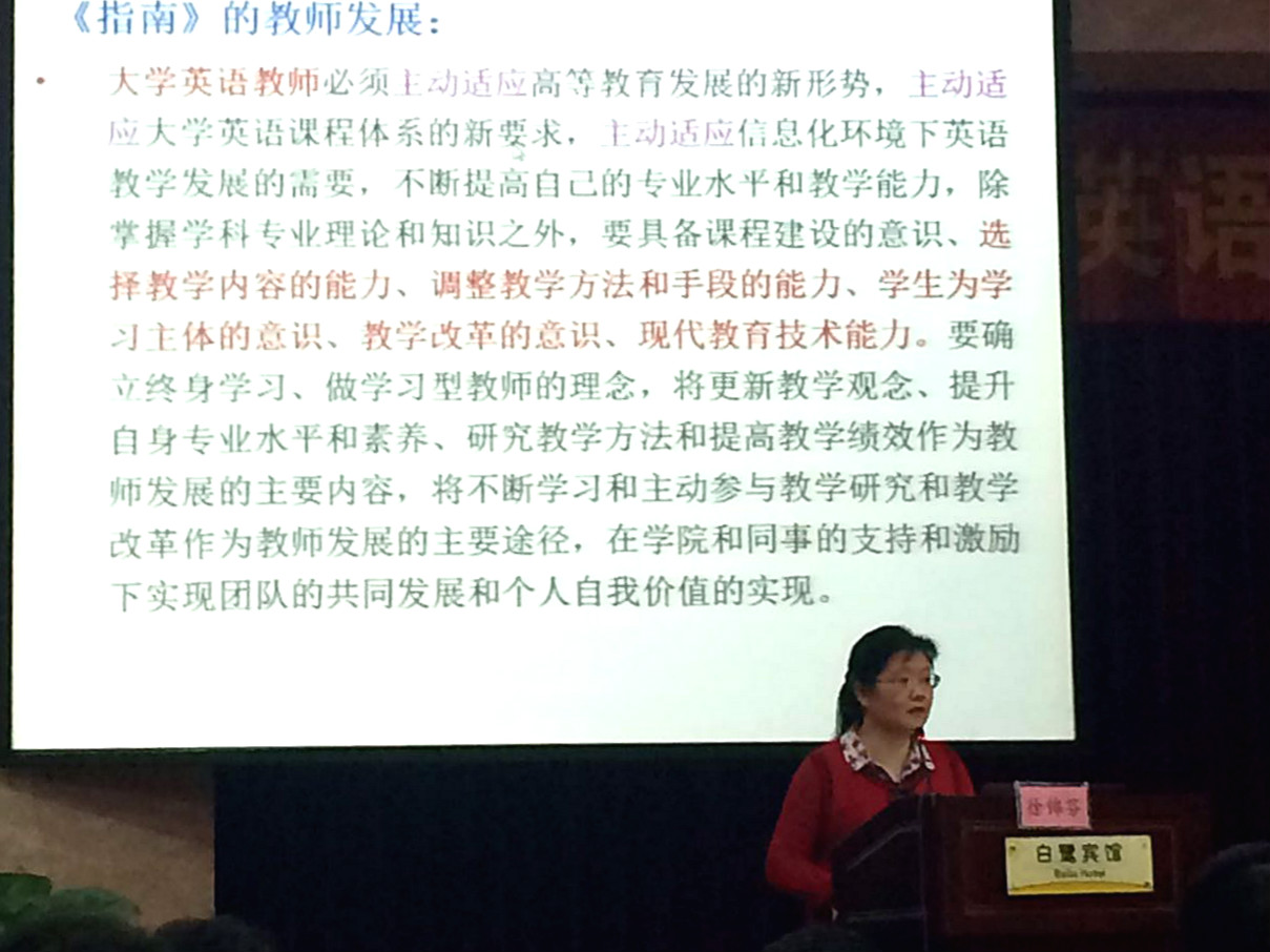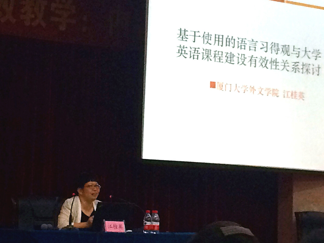 厦门大学博士生导师江桂英教授以“基于使用的语言习得观与大学英语课堂教学有效性关系探讨”为题发言。江桂英教授以基于使用的语言习得观(UBLA)为视角,从宏观、中观、微观层面探讨了UBLA在大学英语教学各个环节中,尤其是课程设置、教材建设、课堂教学等纬度是如何实现的。同时,她还分享了厦门大学大学英语“2+2”教学模式以及改革效果。