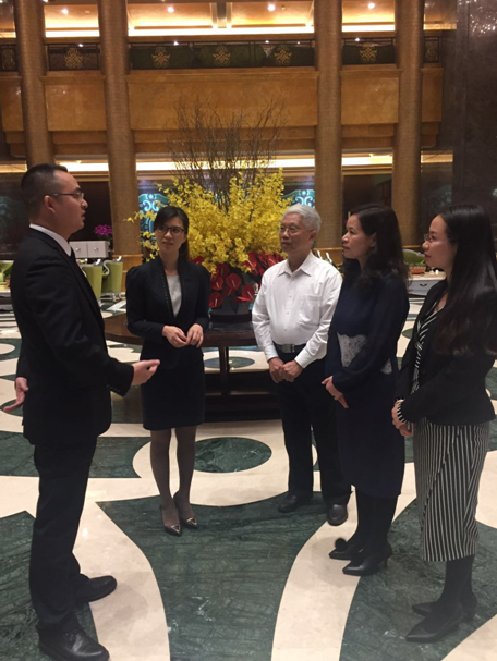 图为曼佧特大酒店梁副总(左一)、尹总监(左二)与廖院长(右二)、黄院长(右三)等交流酒店管理
