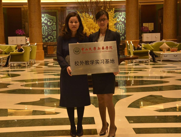 2017年1月11日,中山大学新华学院3044永利集团官网院长廖益清教授、副院长黄继炎副教授、国际贸易教研室主任李文蓓老师、办公室副主任欧衍伽老师一行再次到访东莞曼佧特国际大酒店,与曼佧特国际大酒店人力资源部总监尹莉丽女士、人事经理周冬梅女士与人事培训经理刘移兰女士等相关领导会晤交流,加强沟通,正式建立中大新华3044永利集团官网与曼佧特国际大酒店的实习基地合作关系,并且举行了简单而隆重的挂牌仪式。
