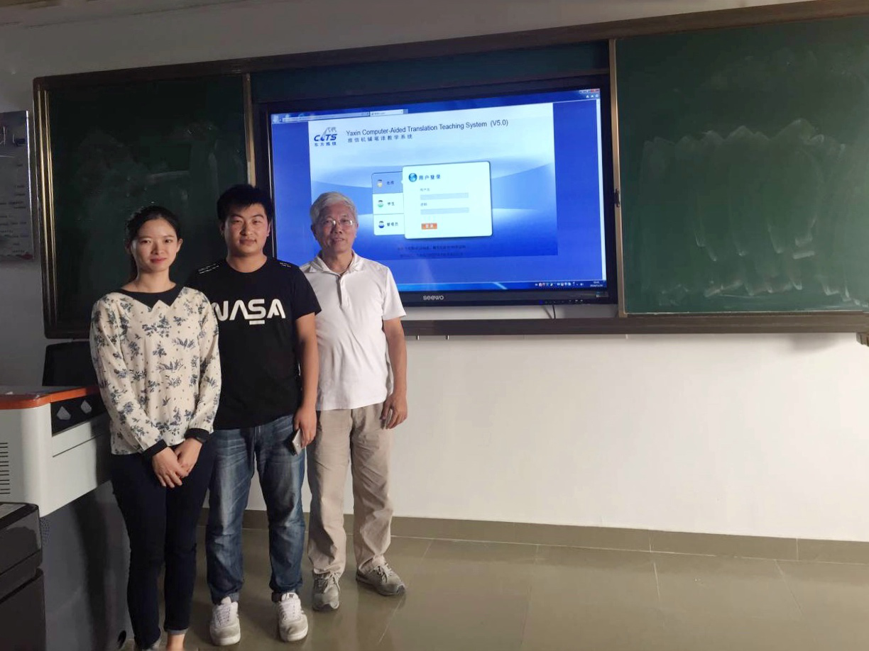 外语系黄继炎副主任(右一)、黄越悦老师(左一)与东方雅信机辅笔译实训系统技术代表张书峰(中)合影
