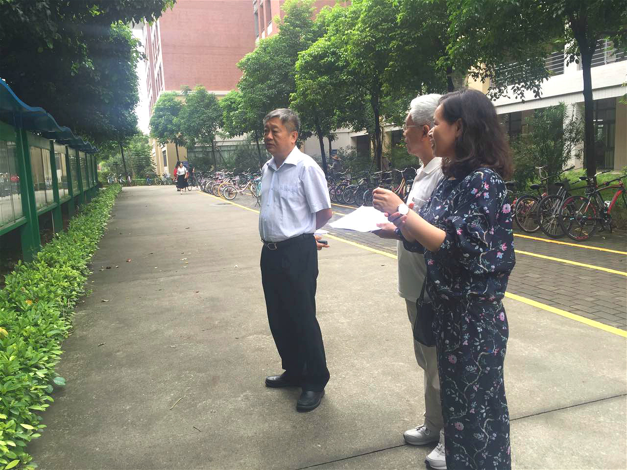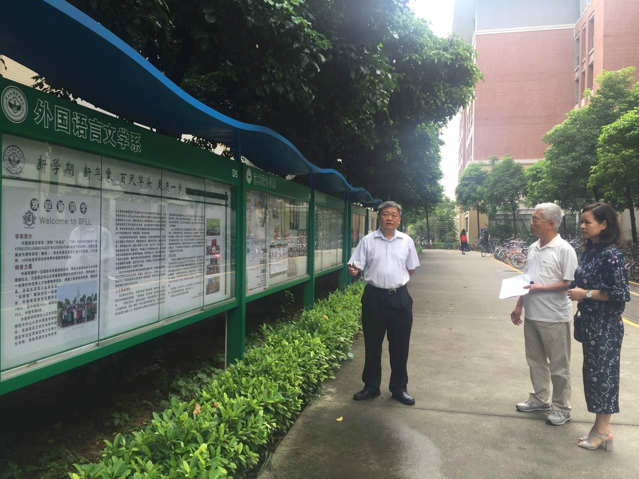 2016年 9月8日上午,中山大学新华学院院长王庭槐来到3044永利集团官网东莞校区巡课,同时对各系部的宣传栏布置情况和宣传内容进行全面检查,外语系主任廖益清、副主任黄继炎陪同检查。