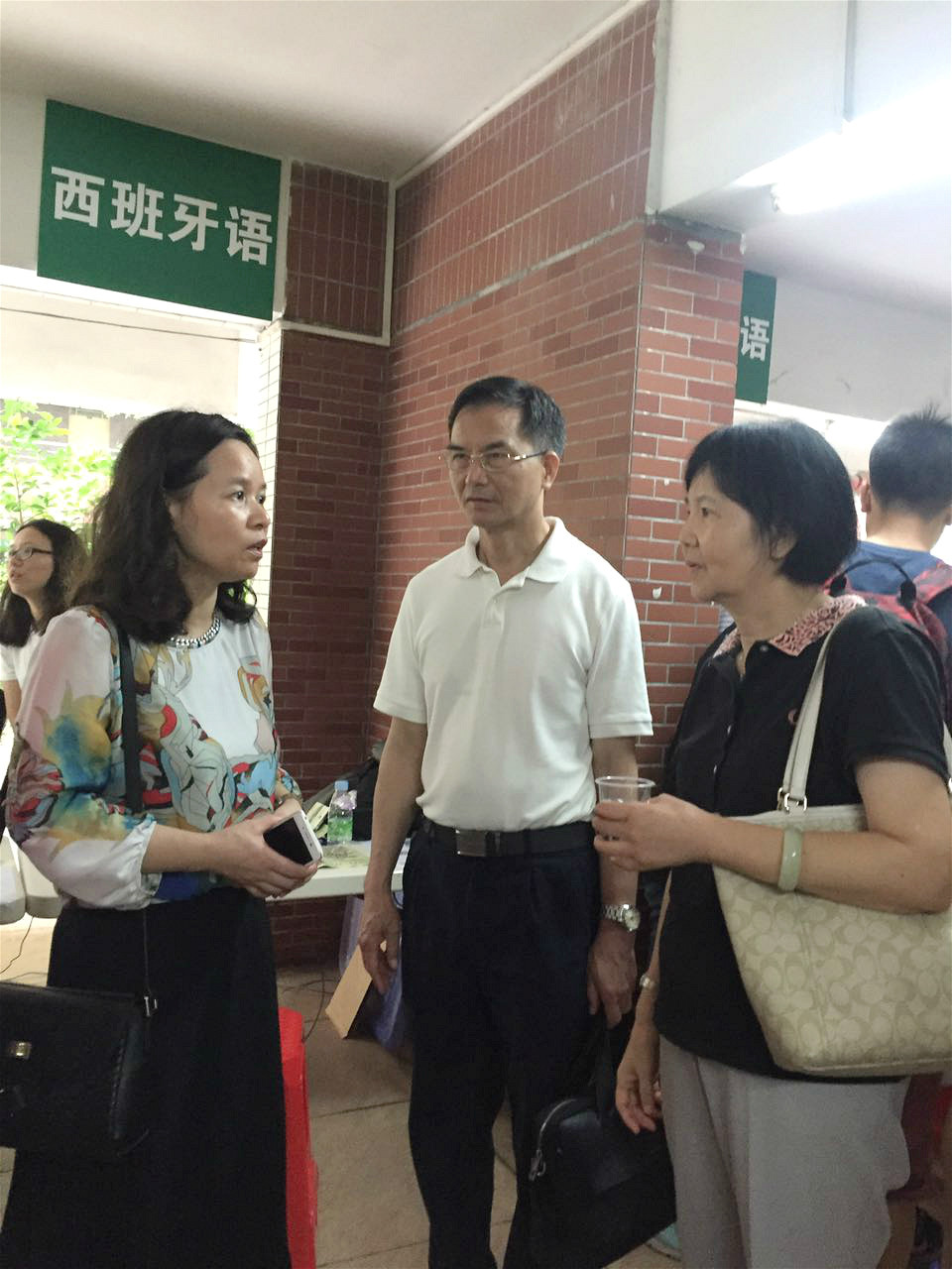 周云书记(右一)、杨卫华副院长(中)向廖益清主任(左一)询问外语系新生报到情况