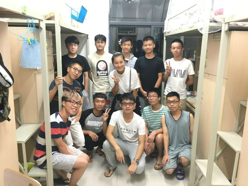 辅导员邢佳佳老师(中)与2016级男生宿舍新生合影