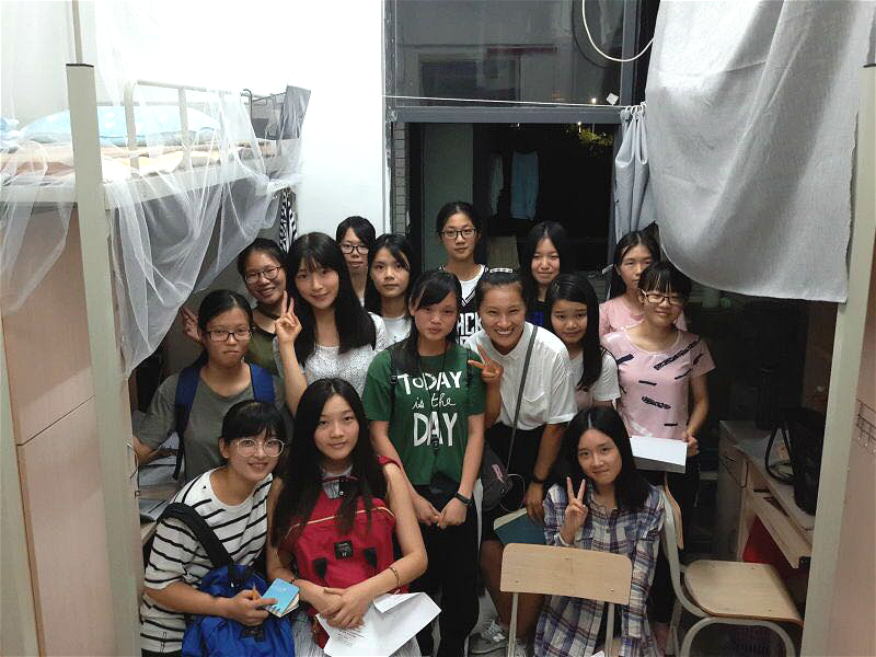 辅导员邢佳佳老师(中)与2016级女生宿舍新生合影