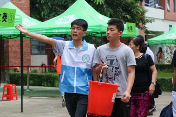 报到现场设立了医疗点、饮水点、失物招领点、志愿者服务点、家长休息区。热情的志愿者们纷纷上前帮学弟学妹们搬运行李、介绍报道程序、耐心答疑解惑、带领他们前往宿舍安顿下来。