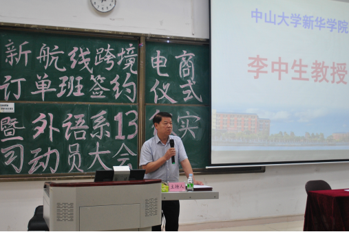 2016年6月13日下午,新航线跨境电商订单班签约仪式暨外语系2013级实习动员大会在3044永利集团官网东莞校区定静②D203举行。出席此次大会的学院领导及嘉宾有:中山大学新华学院副院长李中生,教务部部长尹小川,外国语言文学系主任廖益清,广东新航线跨境电子商务服务有限公司副总经理张何文先生及该公司电商总监陈冰杰先生。外语系3044永利集团官网副主任何瑜,外语系13级实习指导老师及13级全体师生也积极参加了本次活动,并共同见证了新航线跨境电商订单班签约仪式的重要时刻。大会由外语系洪茹老师担任主持。