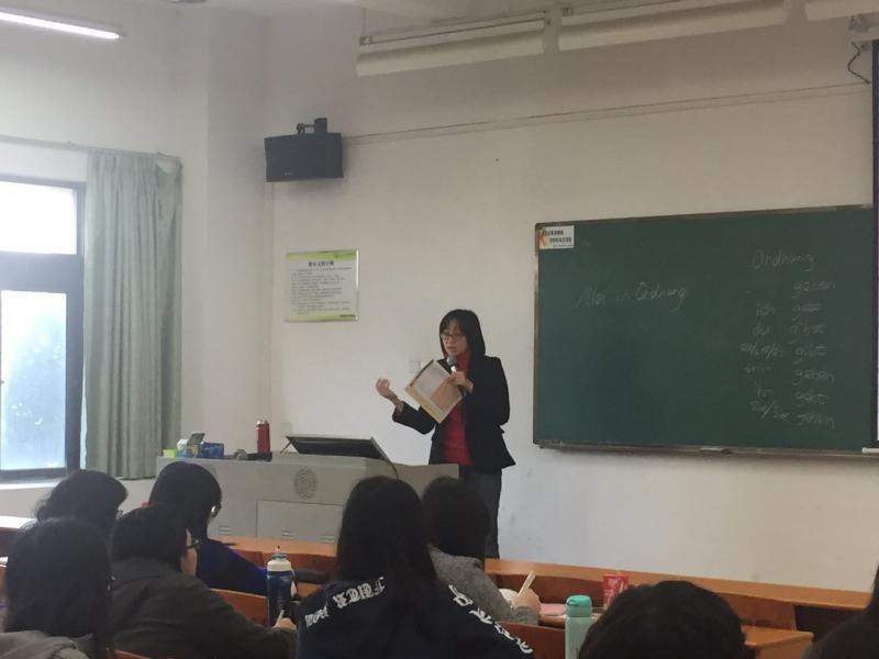 图为洪茹老师在上英语专业2013级《第二外语—德语》课程