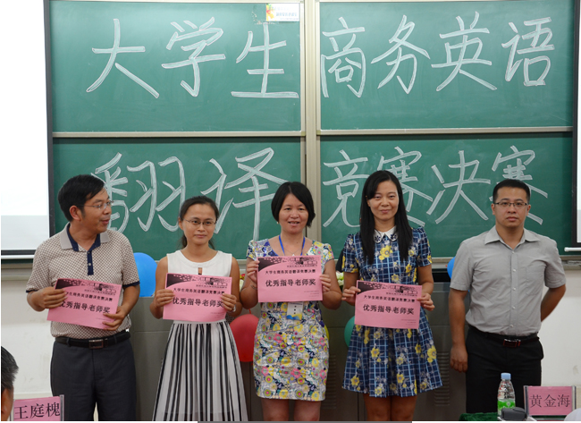 东莞首届大学生商务英语翻译大赛决赛领导、嘉宾及获奖选手合影