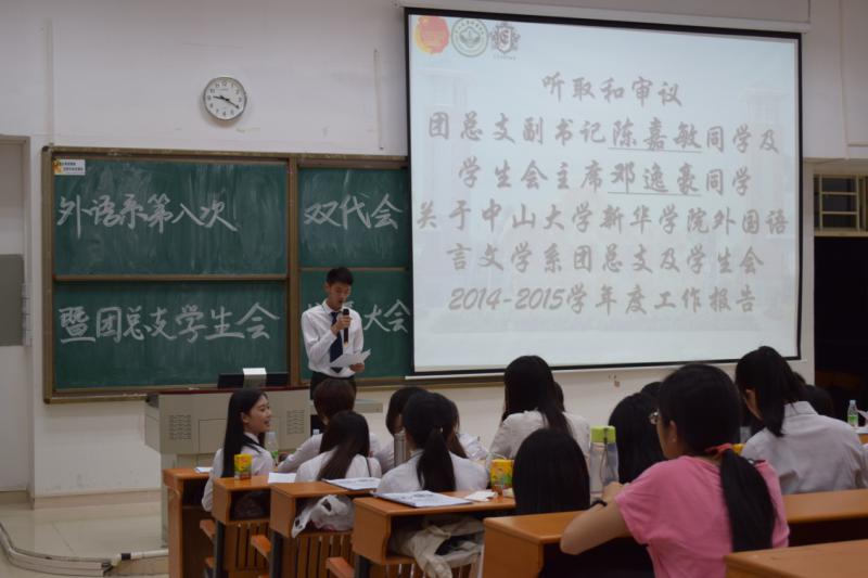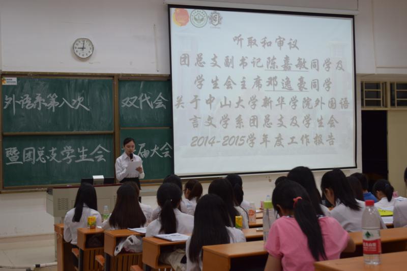 2015年6月14日星期日晚上七点十五分于教二D203,举行了外国语言文学系第八次团员、学生代表大会暨团总支学生会换届大会。外语系办公室副主任林少淇老师、13级辅导员梅星星老师、外语系系主任学生助理、学生工作小组理事长黄哲宇师兄受邀出席了本次大会。同时,团总支秘书长陈丹妮,学生会纪检部副部长黄文婷担任了此次大会的主持人。