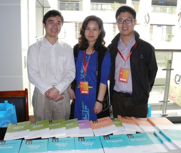 我系廖主任(中)、李贻(右)与中山大学出版社编辑熊锡源(左)在我系出版的教材《英美研究》前合影。