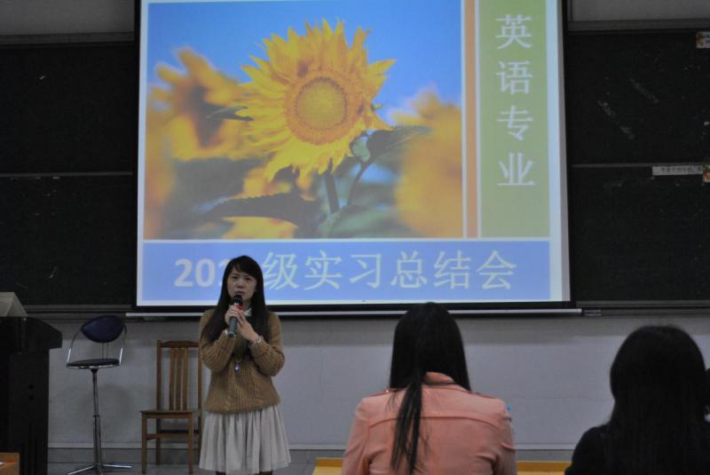 首先,欧衍伽老师做开场致辞,祝贺2011级全体同学顺利完成了实习,现按照学院统一规定召开实习总结大会,提供同学们交流和分享实习心得的平台,从而促进外语系的实践教学。