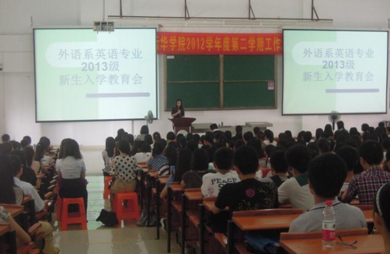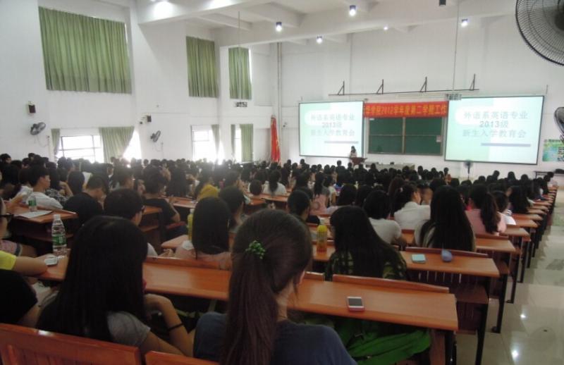 9月17日上午,中大新华外语系召开了2013级新生专业介绍会。与会嘉宾有外语系廖益清主任、优秀教师代表李贻老师、教研办陈依岚老师以及外语系辅导员老师、13级英语专业级导师。会议由外语系秘书欧衍伽老师主持。