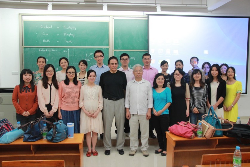 2013年10月22日晚19:30分,“新华学者讲坛”第三讲在东莞校区教学二号楼A402正式拉开帷幕,本次讲座题为《Déjà vu: Latin America and its New Trade Dependency... this time with China》,由教学科研工作部主办,外国语言文学系和经济与贸易贸系共同承办。主讲嘉宾是来自美国德州农工大学的经济学终身教授Jaime Ortiz,主持人为外语系李贻老师,出席讲座的嘉宾有外语系副主任黄继炎副教授,及外语系和经贸系的二十多位教师。