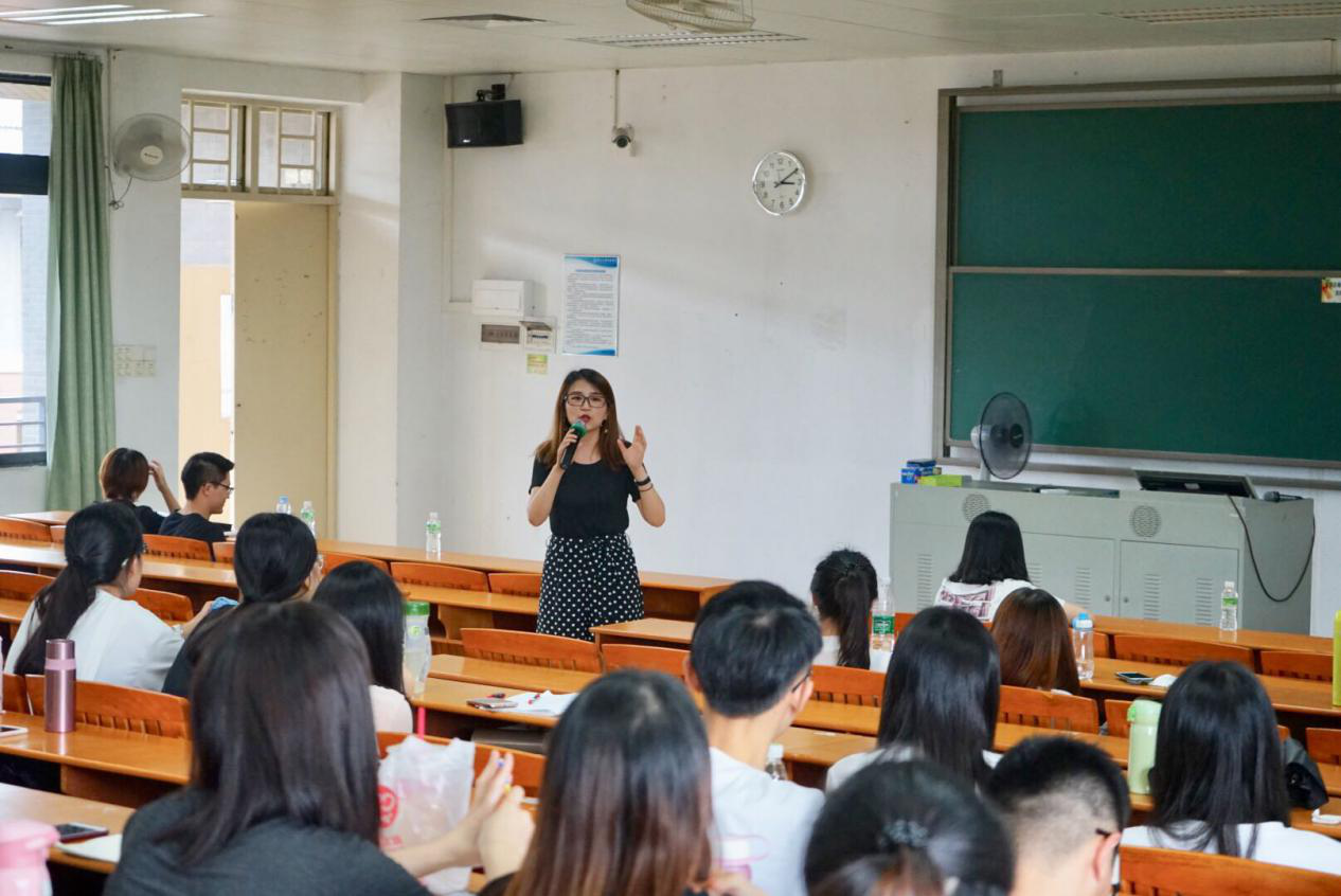 接着,张何文总经理就公司成长机制、学习内容、晋升机制、岗位要求向在座的同学们进行了详细的介绍,使同学们对彤鑫公司的招聘岗位有了进一步的了解。此外,张经理还向在座的同学们介绍了其公司的核心价值观及团队精神。其核心价值观为真诚、务实 、利他及共赢,而团队精神为同心、同德、同向、同行。企业宣讲最后,张何文总经理鼓励同学们积极报名,踊跃参与面试。