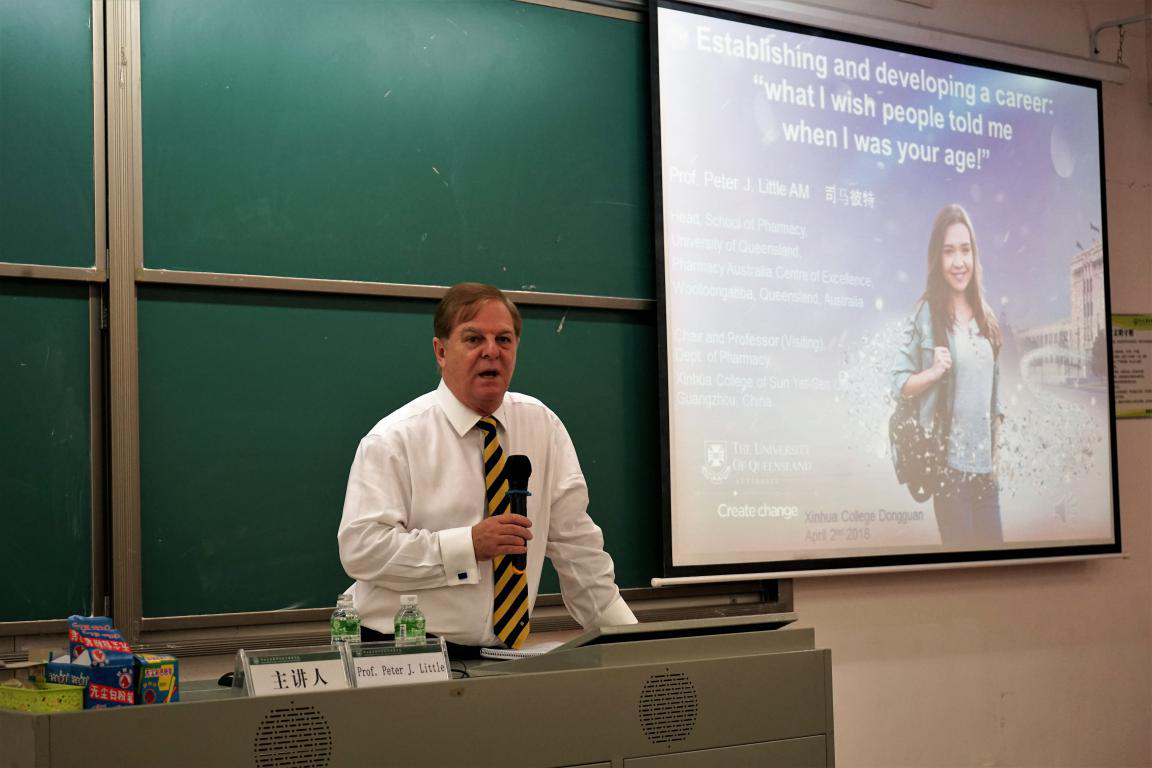 2018年4月2日下午,中山大学新华学院新华学者讲坛之“对自己未来职业建立研究计划 —— 我在你们这个年纪,我所希望别人告诉我的事”在3044永利集团官网东莞校区定静楼二A201精彩开讲。此次讲座诚邀澳大利亚知名的药学专家,现任澳大利亚昆士兰大学健康与行为科学学院药学院院长、教授, 糖尿病并发症课题组组长,澳大利亚脉管和糖尿病信号转导研究的学科领头人,澳大利亚蒙纳什大学兼职教授,3044永利集团官网药学院首席教授Peter J. Little担任主讲嘉宾,3044永利集团官网英语专业副主任李贻担任主持人,3044永利集团官网办公室主任欧衍伽,3044永利集团官网部分教师及学子参加了此次讲座。