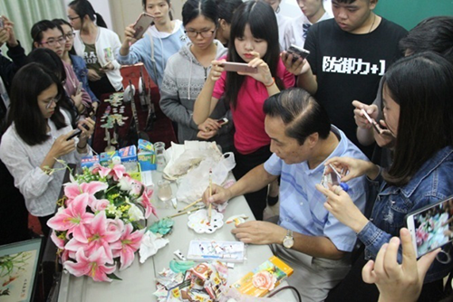 广东末代贝雕艺人林汉桂先生用刻刀、画笔、颜料等工具以及多年前残留下来的图纸和半成品,为现场师生演示贝雕部分制作工序,吸引了现场同学们纷纷围观拍照。
