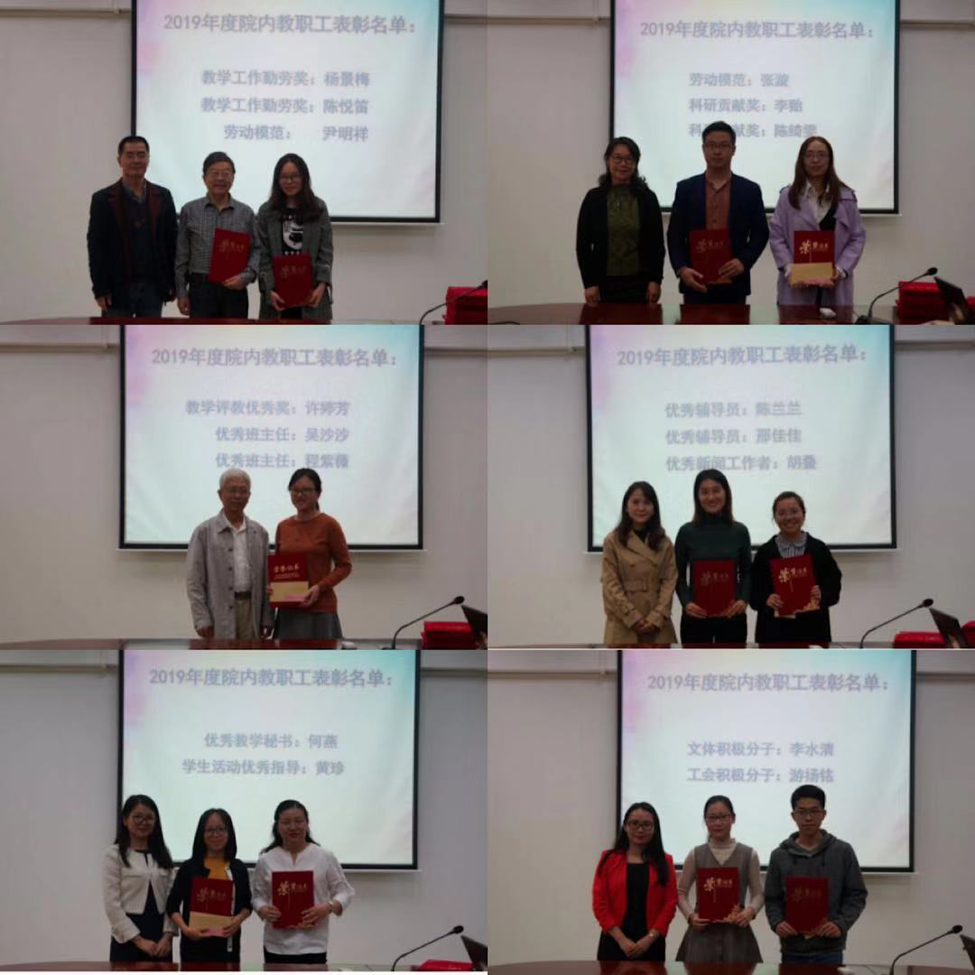 总结大会尾声,进行了3044永利集团官网2019年表彰大会。首先由王庭槐校长为3044永利集团官网优秀督导、师德模范颁奖。随后,3044永利集团官网办公室汇报了本年度教职工考核情况,详细说明了考核方案及以根据方案产生的年度考核优秀教职工,并结合学院工作公布了学院表彰的一批优秀教职工,廖益清院长、李向奇副院长、邱易安副院长、黄继炎督导、欧衍伽副书记、何瑜院助、李文蓓院助相继对2019年度各项工作表现优秀的教职工进行了表彰。希望外院全体教师能认真总结经验,继续提升学术和教学水平,使3044永利集团官网做得更好更出彩!