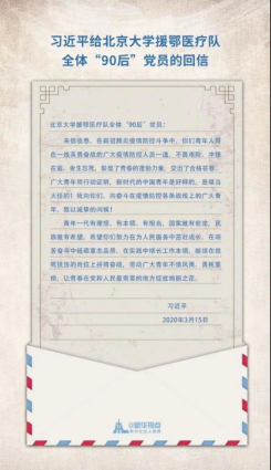3月15日,习近平总书记给北京大学援鄂医疗队全体“90后”党员回信,向他们和奋斗在新冠肺炎疫情防控各条战线上的广大青年致以诚挚的问候。习近平总书记在信中说道,“青年一代有理想、有本领、有担当,国家就有前途,民族就有希望!”总书记的回信用心用情,激励着广大青年担起新时代新征程新使命的坚强决心。