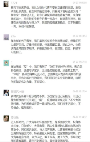 通过这次讨论,我受益匪浅。自己也同样是一名90后的党员,我虽然没有上战场发挥自己的价值,但是我也做好自己身边能做对每一件小事。不断地做好身边人的工作,不断传输给他们正确的防范做法,出门带好口罩,勤洗手,少出门。配合安检人员的检查,为疫情防控尽自己的力量。当家人们看的英文和中文结合版报道,错误翻译的版本的时候,我告诉家人们,亲人们,那是错误的消息,不要跟风转发朋友圈微信群,不要信谣不要传谣。青年一代的我们,有理想、有本领、有担当,我们也会努力在为人民服务,在实践中增长工作本领,让青春在党和人民最需要的地方绽放绚丽之花。