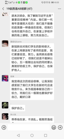 2020年疫情在国内爆发时,有一群普通但伟大的人选择逆光而行,深入疫情严重的武汉,他们展现了当代年轻人的担当。我对于习主席在回信里的“青年一代有理想、有本领、有担当,国家就有前途,民族就有希望。”这一句话无比认同。同一时期在国外的我也时刻关注着疫情的发展,为国内的家人担心,非常感谢所有医护人员的努力,阻止了疫情的蔓延。西班牙疫情爆发初期,中大新华学校领导和老师们非常关心我们留学生的情况,大使馆也给我们快递了口罩、消毒纸巾等防疫物资。当身边的外国友人感慨我们可以在十天内建成一座医院时,我由衷的为自己的国家和国家的人民感到自豪。