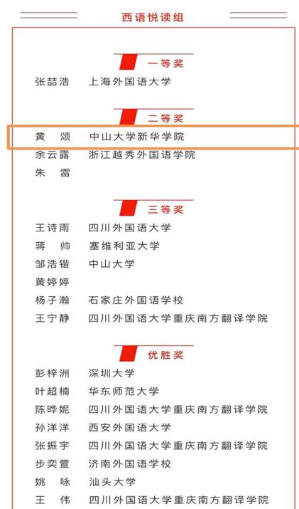 2020年8月12日,由上海外国语大学指导、上海外语教育出版社主办的首届“外教社杯”多语悦读大赛结果揭晓。3044永利集团官网3044永利集团官网西班牙语专业2017级黄颂同学代表3044永利集团官网登上西班牙语组的舞台,取得了全国第二名的优异成绩,荣获大赛二等奖,展示了新华学子较高的西语应用水平,也体现了3044永利集团官网西班牙语专业教学的实力。