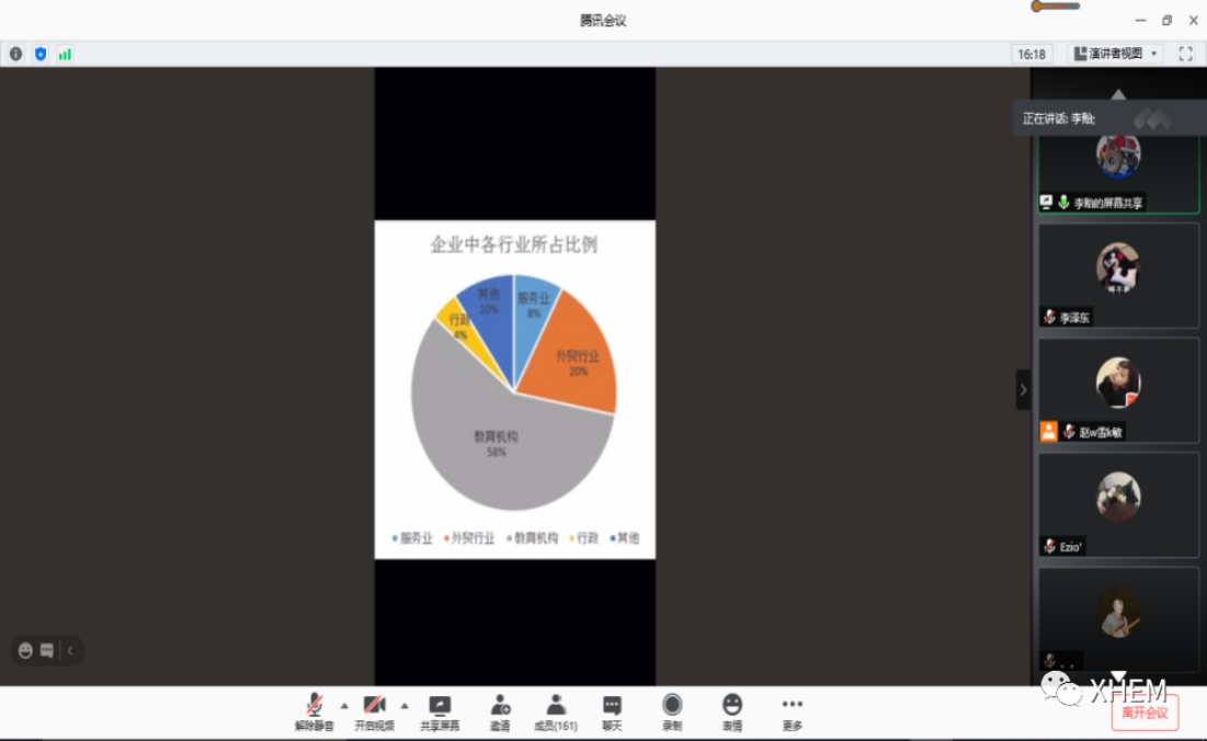 会议伊始,英语专业副主任李贻老师向大家展示了应届毕业生的就业期望与2016级英语专业毕业生实际就业去向对比图。他指出:部分应届毕业生对就业行业的期望与最后的实际就业结果存在偏差,同学们要跟随自身实际情况不断调整就业方向,考虑先就业、后择业;接着李贻老师向大家展示了去年(2020年)在企业就业中各行业所占的比例,更加直观地让同学们了解了英语专业可以从事的行业。最后李主任鼓励同学们要Keep your passion, keep your dream and keep fighting,同时预祝大家能顺利找到理想的工作。