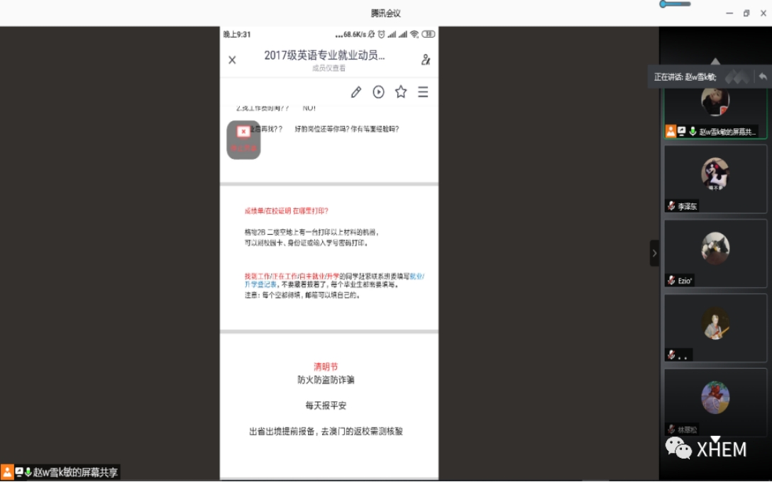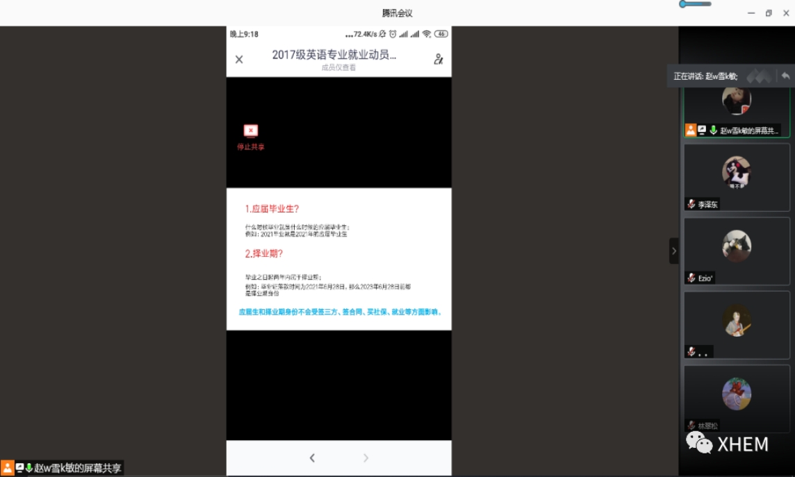 最后,辅导员赵雪敏老师为同学们解释了应届毕业生和择业期的概念,并对同学们日常经常询问的问题作出回答,同时强调在疫情期间,同学们每天仍需坚持报平安,并做好防疫工作和就业准备。