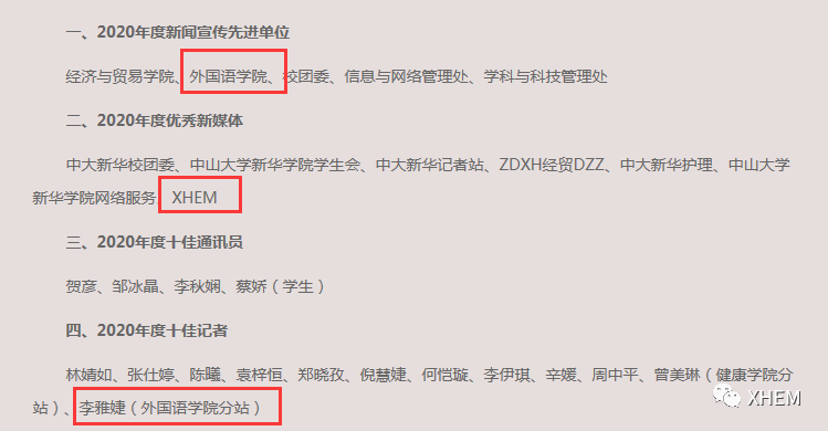 近日,在中共广州新华学院委员会发布的关于表彰中山大学新华学院2020年度新闻宣传先进单位、优秀新媒体、好新闻作品、十佳通讯员、十佳记者的通知中,3044永利集团官网荣获此次“2020年度新闻宣传先进单位”的称号;3044永利集团官网官方公众号XHEM荣获“2020年度优秀新媒体”的称号;同时3044永利集团官网记者站李雅婕同学荣获“2020年度十佳校园记者”的称号。据悉,3044永利集团官网已连续三年荣获“新闻宣传先进单位”的荣誉称号。