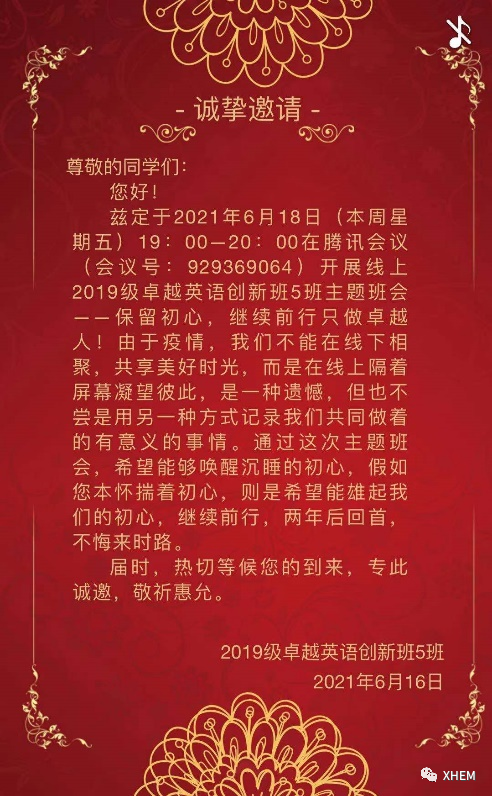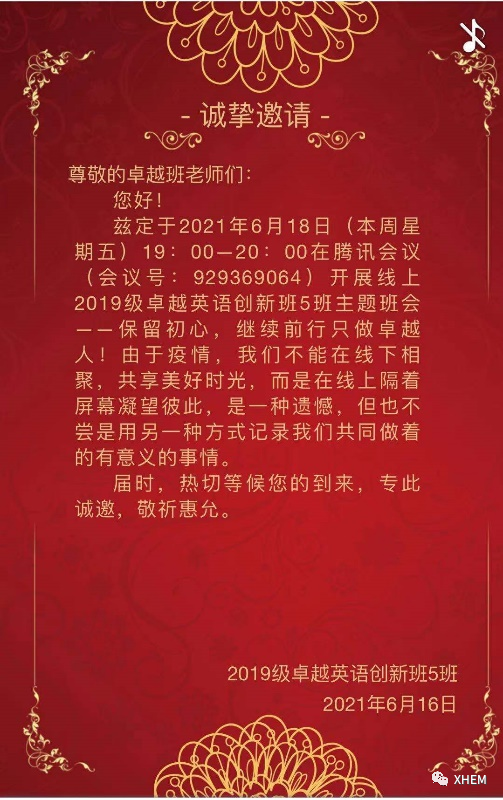 每一年凤凰花开时,就是一个学生走向另一个更高台阶的好时机,开启新的奋斗征程。两年的卓越班生活,充满着欢声笑语,这些甜蜜的回忆也将随着我们的结业而画下一个完整的句号。但终点也是新的起点,我们依然还会带着那份初心继续前进。在六月下旬,2019级卓越英语创新班5班(以下简称卓越5班)班委们精心策划了“保留初心,继续前行,只做卓越人”线上结业主题班会,并邀请卓越班老师们和卓越5班全体同学一起参加。