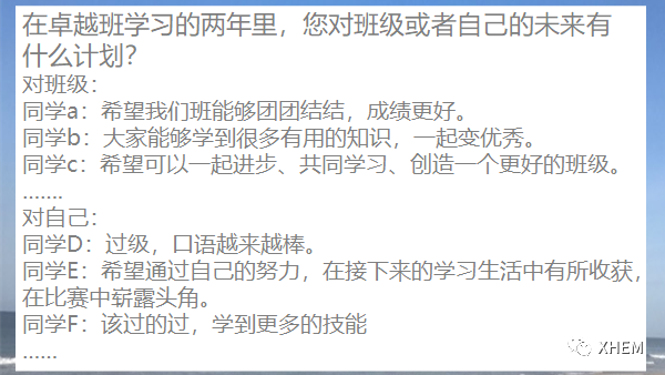 应该说当时报名卓越英语班是一个正确的决定,因为在这里我学到了很多东西,也认识了很多优秀的老师和同学!在这个班也是促使我更加自律了,因为觉得如果不努力会跟不上其他同学的步伐。这两年教我们的老师也很好很好,很有趣,也很负责任!所以我很喜欢这个班级,也非常感谢每一位老师的辛苦付出!