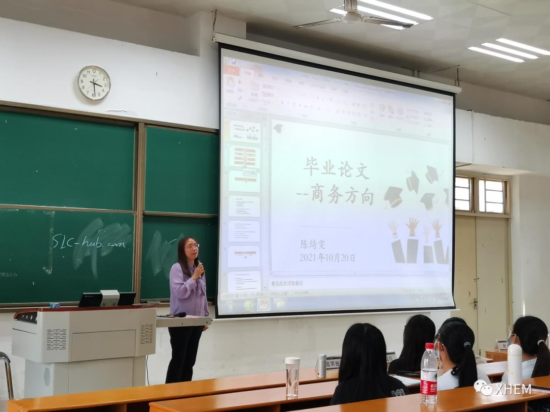 副院长何瑜结合自身经验向同学们详细介绍了如何进行毕业论文选题和如何撰写文献综述及设计问卷,同时,她提醒同学们要严肃对待毕业论文写作,合理安排好学习时间,按时提交开题报告及毕业论文初稿。