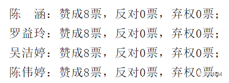 本支部应到正式党员10名,实到8名,经过评议和无记名投票表决,同意陈涵等4名同志按期转正为中共正式党员。名单及得票情况如下: