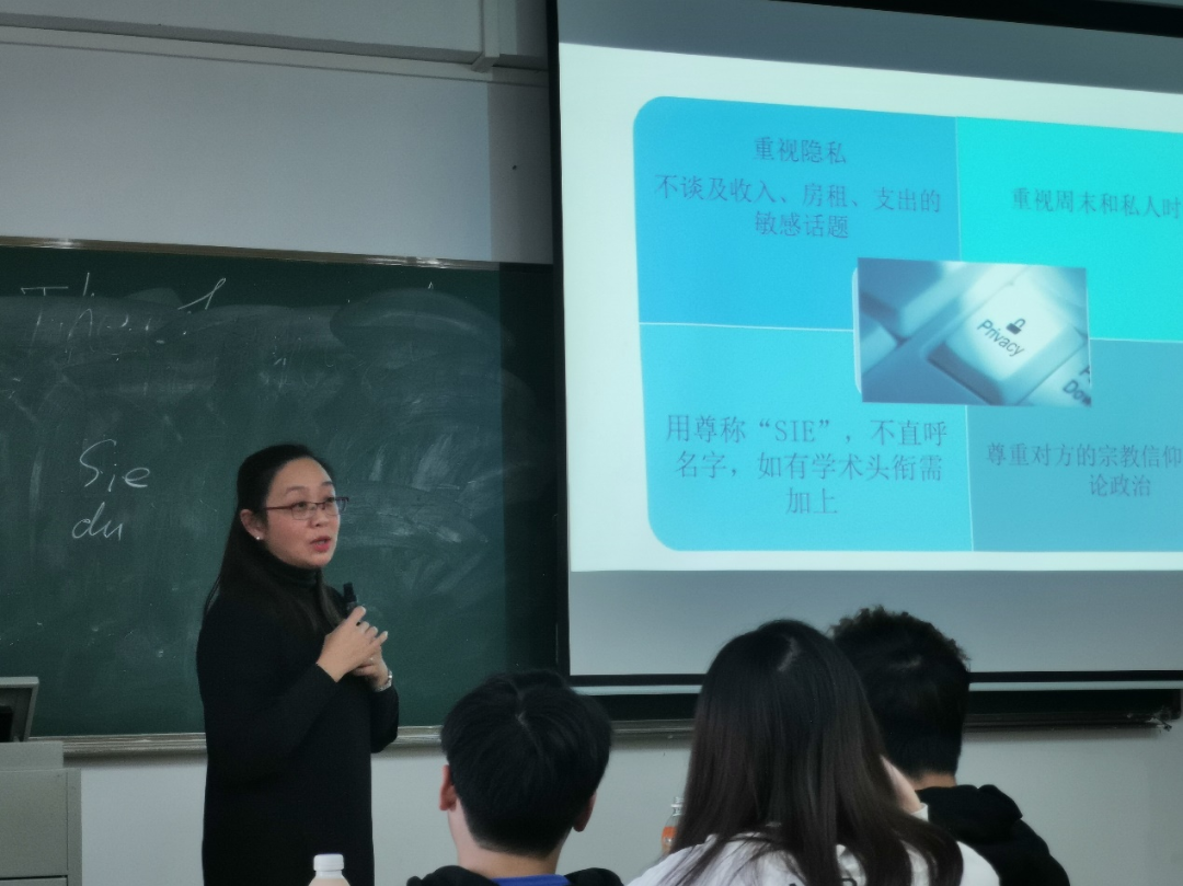 讲座第三部分涉及的是中国与德语国家交往中,主要存在的生活习惯的差异、思维方式的不同和处理问题方式的差别。洪茹老师通过自己的留学经历和德企工作的体会,与同学们互动交流了中国与德语国家跨文化交际冲突处理的要点,梳理了产生冲突和差异的原因,让大家在笑声中有所体会和反思,进一步增强了同学们学习提高跨文化能力的意愿,增加了大家对德语国家商务文化的知识,拓展了大家的视野和思路。