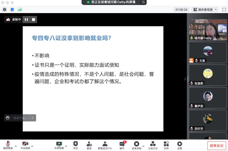 钱河颖老师针对大四同学们关于就业的一些普遍问题做了解答,并展示了如何通过就业信息进行自我评估的方法。钱老师告诉大家,由于疫情的特殊原因,大家不必过度忧心没有专四专八证的影响,更多的其实在于自身的专业能力。大四毕业生要转变就业思维观念,勇于踏出第一步,才能为自己带来更多机会。