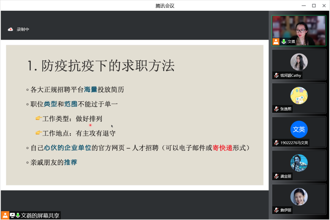 李文蓓老师从防疫抗疫下的求职方法、简历编写技巧、如何在面试时突出自己、如何排解求职过程的压力四个方面为同学们进行经验分享,鼓励大家拓宽思路,做好工作类型的排列,多多尝试,运用不同的简历投递方式,也许能增加面试机会。