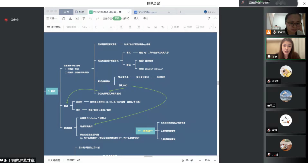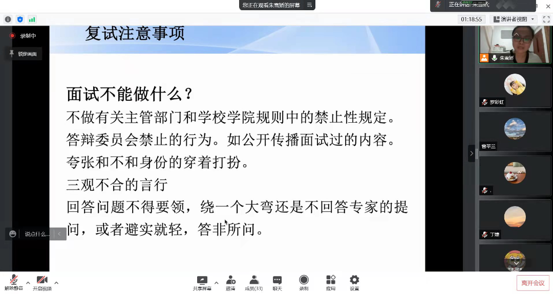 指导会邀请了3044永利集团官网优秀毕业生丁婕和李晓婷分享经验。大师姐丁婕博士从复试、日常学习规划心得和压力与自我管理三个方面为师弟师妹们分享了她的心得。她提醒同学们要密切关注招生单位的复试要求,加强与招生单位的联系,做好复试准备阶段的日程规划工作等。小师姐李晓婷是调剂上岸的,她建议师弟师妹们若决定调剂,则切记“不打无准备之仗”,从精神准备、物资准备、知识准备三方面提供了调剂方面的备考建议,并就学生口语表达、专业知识、模拟复试等方面的问题进行了指导。接着,朱雪娇老师从“你报考的学校、学院、专业是什么样的”“面试老师喜欢什么样的学生”“面试不能做什么”切入,指导学生要清楚选择报考学校的原因,熟悉报考学校的基本情况;要从专业形象、心理素质等方面不断提升自己;要从学习能力、综合能力、个人专长方面充分展示个人的综合素养。罗彩虹老师就前面的讲解进行了总结,指出线上复试需要注意设备和网络问题,提醒大家密切关注各校复试出分情况,做好充分的复试和调剂准备。