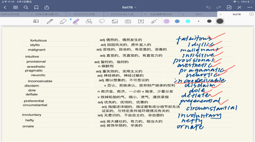 (我背单词的方法)是将单词打到平板上,再反复进行中英默写或盖住中文或英文嘴巴说出释义,这样可以容易找到文件不用麻烦拿着很多的纸张,也能完成默写工作。当然合适自己的是最重要的哒!如果7月前我们能够大量摄入单词,会发现有助于阅读、翻译、写作、语法,并且对专四专八都是互通的,