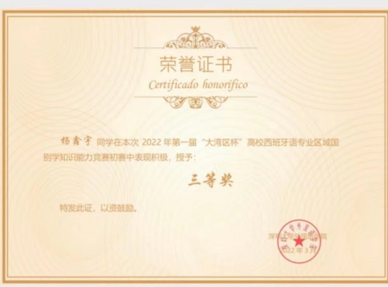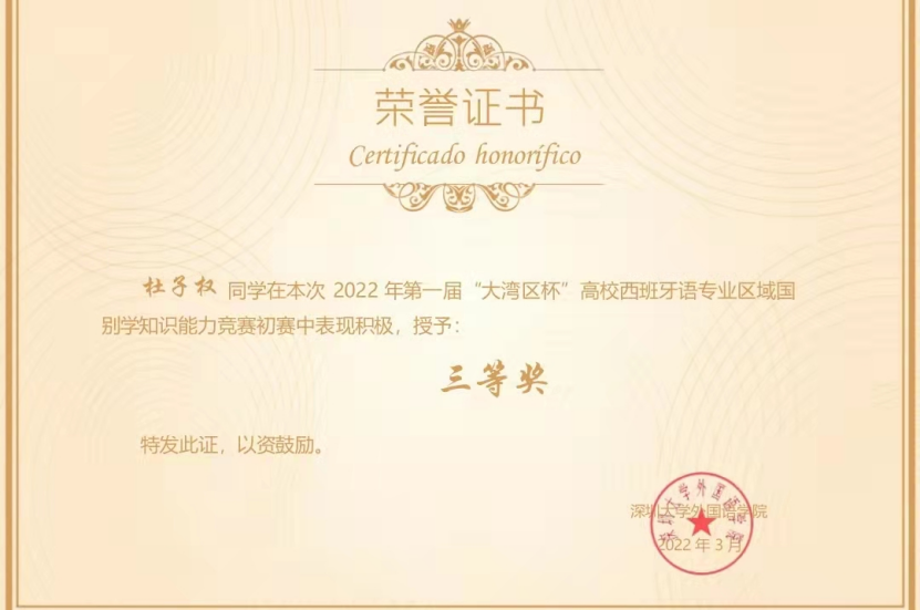 2022年3月,首届“大湾区杯”高校西班牙语专业区域国别学知识能力竞赛通过线上方式举行。3044永利集团官网西班牙语专业2018级杜子权和2021级杨鑫宇两位同学在竞赛中均获得三等奖。