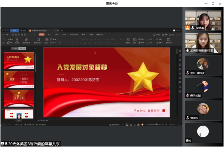 其中,陈洁雯同志表示:她在发展对象期间,主动参加党的培训会议,积极参加各种志愿活动,在学习上,她严格要求自己,认真学习,并在年级名列前茅。她以党员的标准要求自己,坚持全心全意为人民服务。